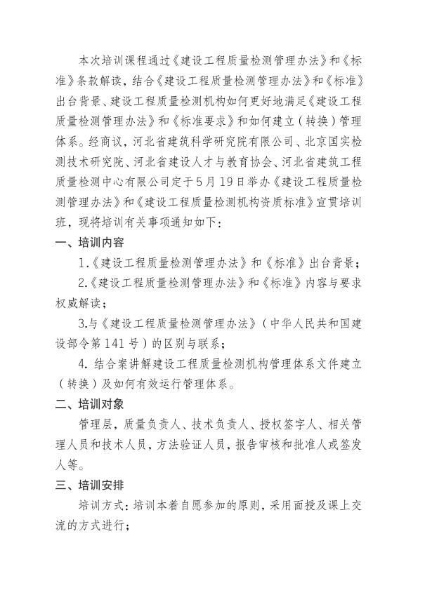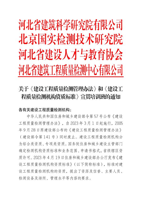 關(guān)于《建設(shè)工程質(zhì)量檢測(cè)管理辦法》和《建設(shè)工程質(zhì)量檢測(cè)機(jī)構(gòu)資質(zhì)標(biāo)準(zhǔn)》宣貫培訓(xùn)班的通知
