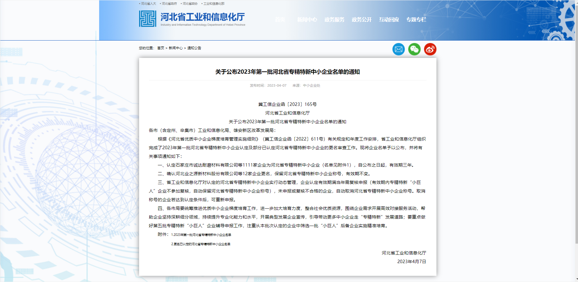 2023年4月7日,河北省工業(yè)和信息化廳發(fā)布《關(guān)于公布2023年第一批河北省專精特新中小企業(yè)名單的通知》,河北冀科工程項目管理有限公司被認定為2023年“專精特新”中小企業(yè)。