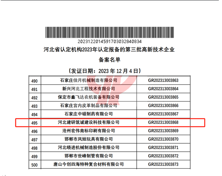 2023年12月20日,全國高新技術(shù)企業(yè)認定管理工作領(lǐng)導(dǎo)小組辦公室公示了河北省認定機構(gòu)2023年認定報備的第三批高新技術(shù)企業(yè)備案名單,河北建研筑誠建設(shè)科技有限公司順利通過了國家高新技術(shù)企業(yè)認定(證書編號GR202313003868),標志著公司在科技創(chuàng)新的道路上又邁出了堅實的一步。