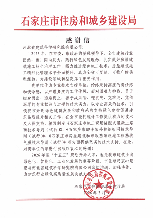 2月3日我公司收到石家莊市住房和城鄉(xiāng)建設(shè)局發(fā)來的感謝信。信中對我公司在2025年石家莊市建筑行業(yè)綠色發(fā)展、揚塵治理及技術(shù)創(chuàng)新等工作中提供的專業(yè)支撐給予高度認(rèn)可,對我公司團(tuán)隊的辛勤付出致以誠摯謝意。